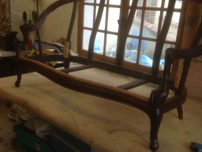 Dans un premier temps nous procédons à un detapissage du fauteuil puis à un nettoyage et collage complet suite à cette étape nous commençons la réfection complète du bien que vous nous avez confié